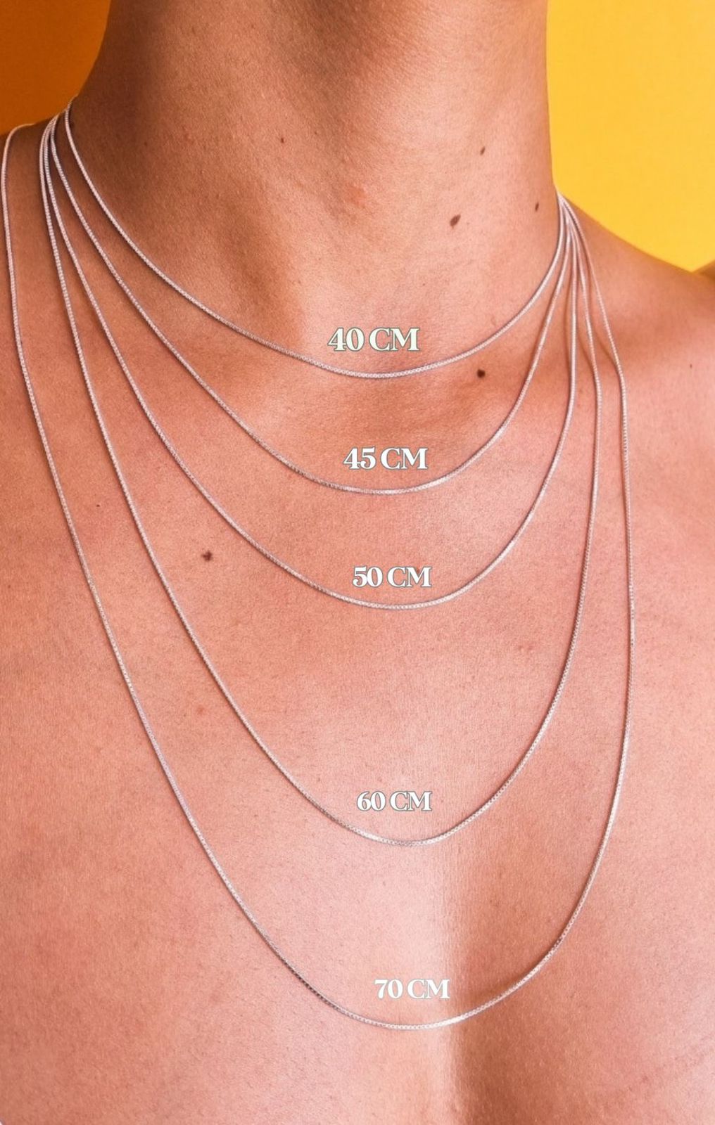 70 cm – comprimento mais longo, muito usado em correntes masculinas.